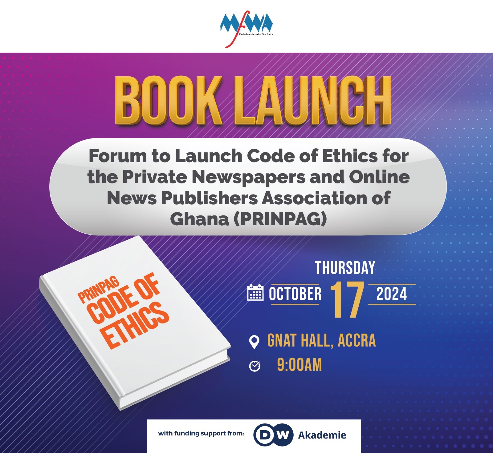 The Media Foundation for West Africa (MFWA) in collaboration with the Private Newspapers and Online News Publishers Association of Ghana (PRINPAG), will launch a Code of Ethics for PRINPAG to guide the work of members of the Association. The launch is scheduled for Thursday, October 17, 2024 in Accra.