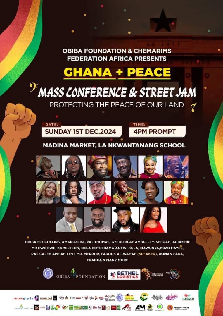 The Obiba Foundation and Chemarims Federation Africa are thrilled to announce the highly anticipated Ghana+Peace Mass Conference & Street Jam, an inspiring initiative to champion unity, harmony, and the preservation of peace in Ghana. The event will take place on Sunday, December 1, 2024, at the Madina Market, La Nkwantanang School, starting promptly at 4:00pm sharp.