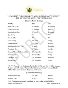 With only four days remaining in office, Ghana’s President, Nana Addo Dankwa Akufo-Addo, has officially declared the national holidays and observances for the year 2025, marking a significant step in his administration’s final days before transitioning power.