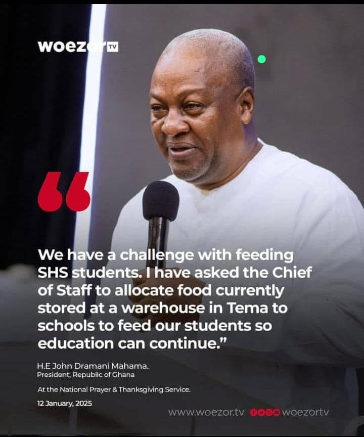 “This food was imported by the outgone government in response to the drought that occurred last year but in this emergency, we need to use some of that food to feed our students so that education can continue,” he said during National Prayer and Thanksgiving Service held in Accra on Sunday, January 12.