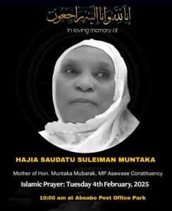Hajia Saudatu Sulemana Muntaka, mother of Interior Minister and Member of Parliament for Asawase, Alhaji Mohammed Muntaka Mubarak, has passed away at the age of 83.
