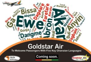 Multiple award-winning international airline Goldstar Air, the wings of Ghana and the belly of America will welcome passengers with five key Ghanaian languages: Ewe, Akan, Hausa, Ga-Dangme, and Dagbani, in addition to English, the official language on board our flights to and from all destinations. French and Arabic languages will also be use where necessary.