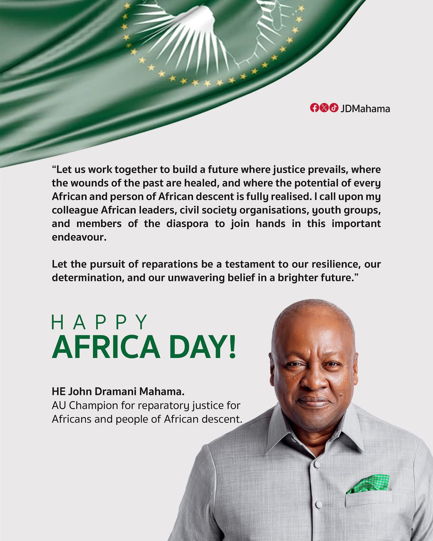 President of Ghana, H.E. John Dramani Mahama, has reiterated his call for unity among African leaders and the global African diaspora in the fight for reparatory justice. In a message posted on his official Facebook page to mark Africa Day, John Mahama urged stakeholders across the continent and beyond to work together towards a future grounded in justice and healing.