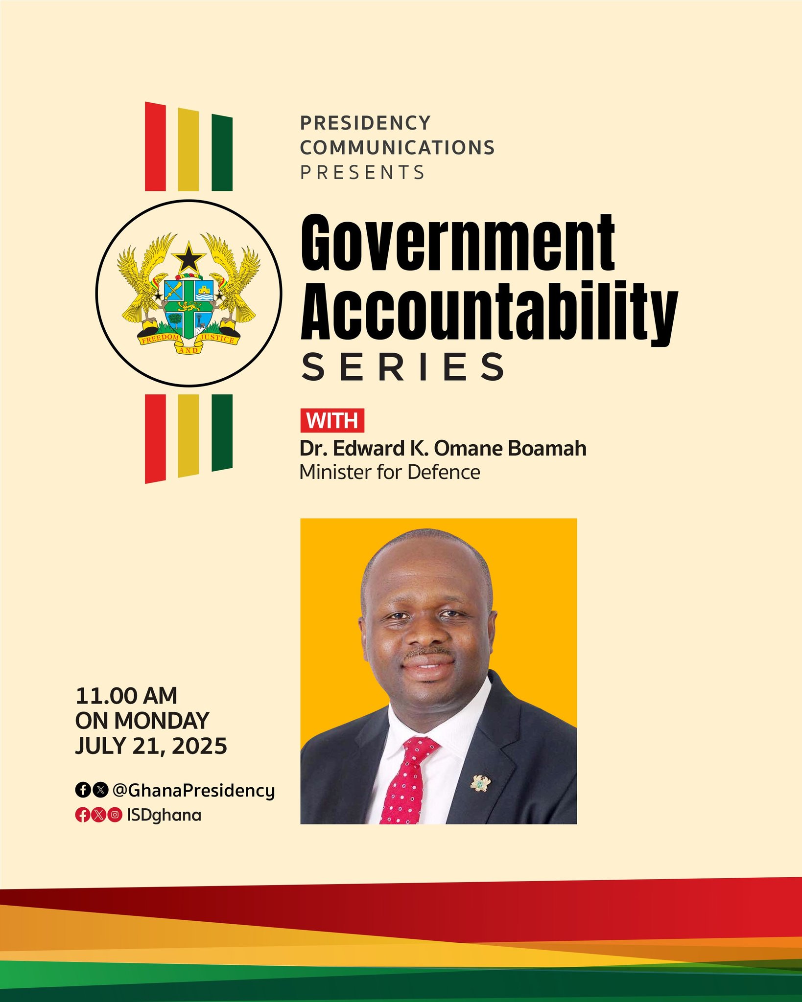 The address, part of the Government Accountability Series, will focus on recent developments within the security sector, touching on both internal and external matters. Dr. Omane Boamah will also present a comprehensive report on the performance of the Defence Ministry, outlining ongoing efforts to safeguard national stability.