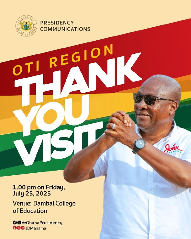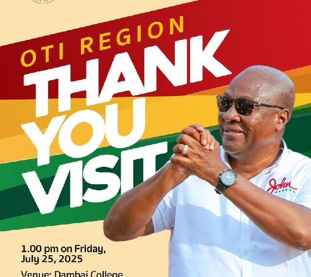President John Dramani Mahama will arrive in the Oti Region today as part of his nationwide “Thank You” tour to express appreciation to Ghanaians for their continued support and commitment to democratic governance.