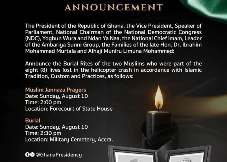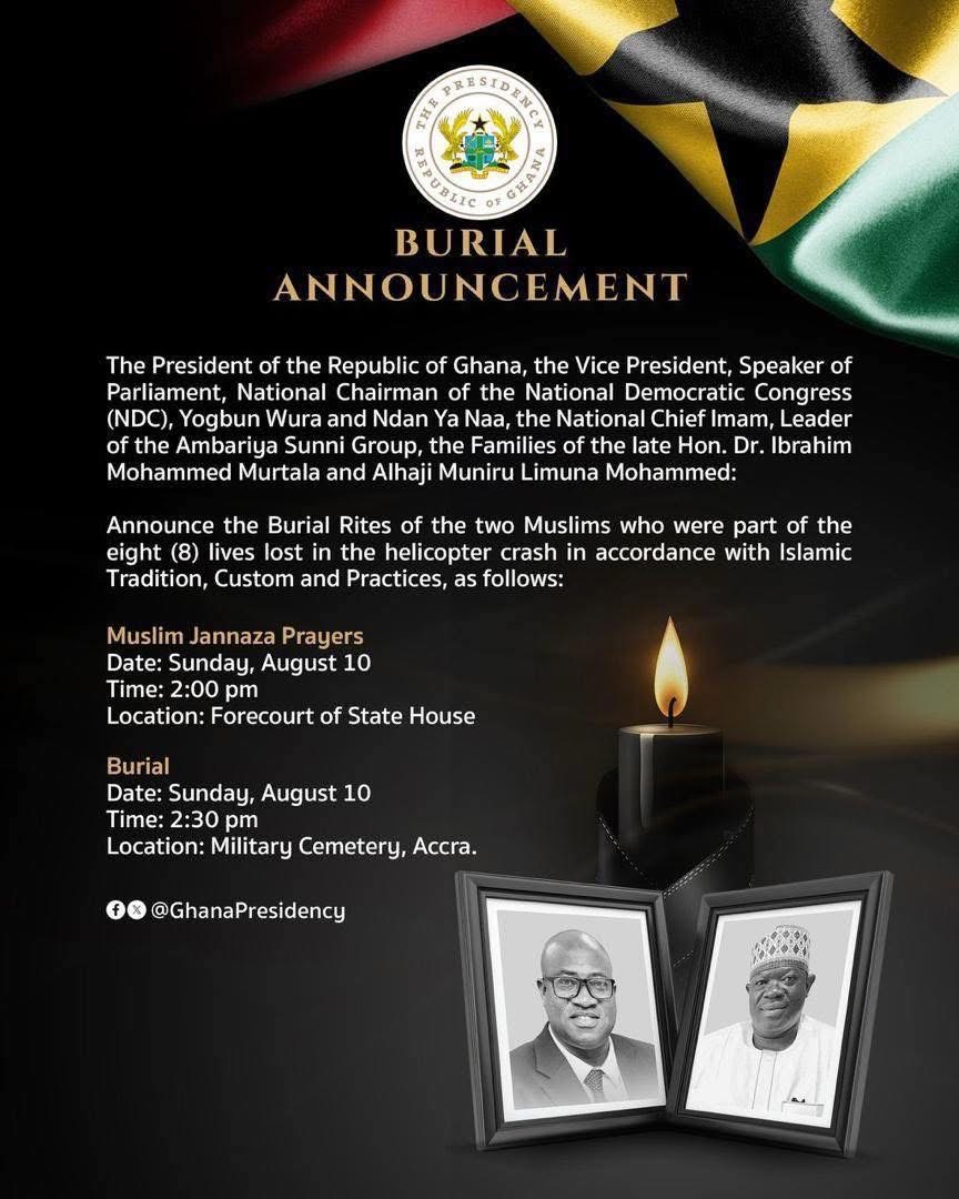 The Government of Ghana, in collaboration with the families of the late Hon. Dr. Ibrahim Mohammed Murtala and Alhaji Muniru Limuna Mohammed, has announced the burial rites for the two Muslim leaders who were among the eight victims of the recent military helicopter crash.