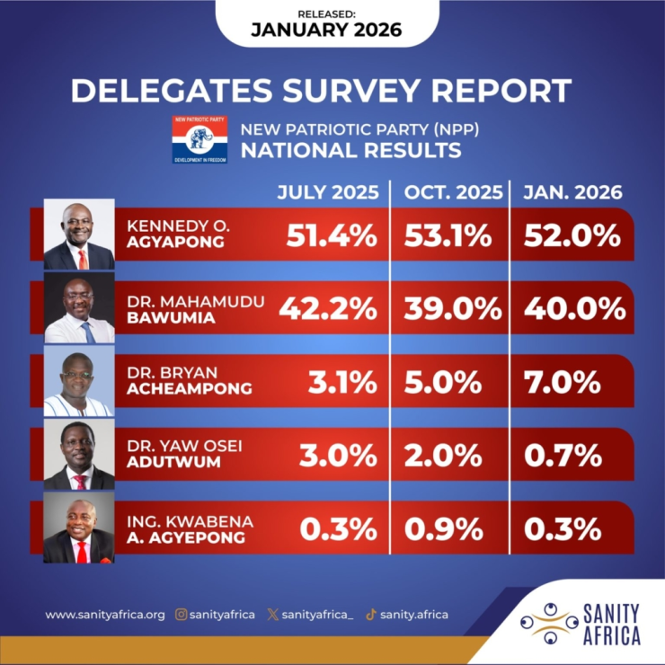 Kennedy Ohene Agyapong has emerged as the clear front-runner in the New Patriotic Party’s (NPP) presidential race, according to the latest Phase Three delegates’ survey released by Sanity Africa ahead of the party’s primaries scheduled for January 31, 2026.